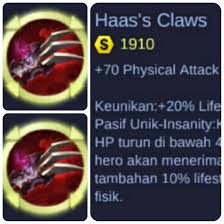 Menambahkan 70 serangan fisik dan mengurangi 10% cooldown skill. Skill aktifnya samalah dengan item Hunter Strike. Tapi item ini lebih istimewa, karena ketika darah sobat terkena damage, maka dengan item ini darah hero sobat akan bertambah sebanyak 20%. Keren kan?